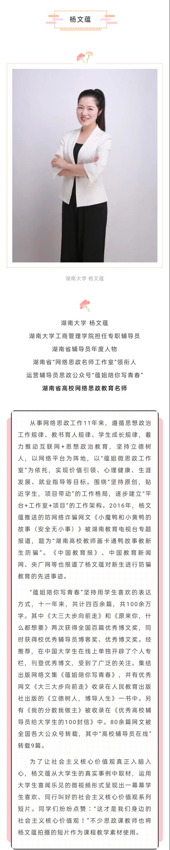 杨文蕴:湖南大学工商管理学院辅导员、湖南省辅导员年度人物、第一批“湖南省高校网络教育名师培育支持计划”入选者
