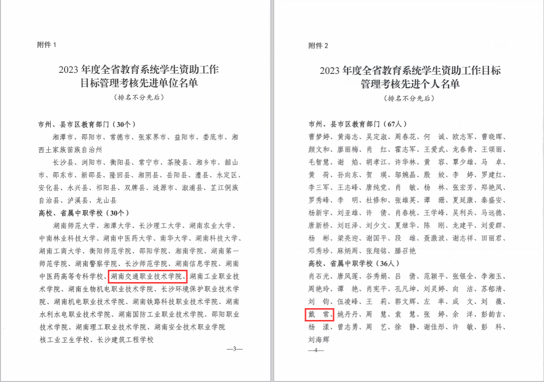 2月21日,湖南省教育厅下发《关于2023年度全省教育系统学生资助工作目标管理考核先进单位和先进个人的通报》,湖南交通职业技术学院被评为“2023年度全省教育系统学生资助工作目标管理考核先进单位”,学生工作部戴常被评为“全省教育系统学生资助工作目标管理考核先进个人”。