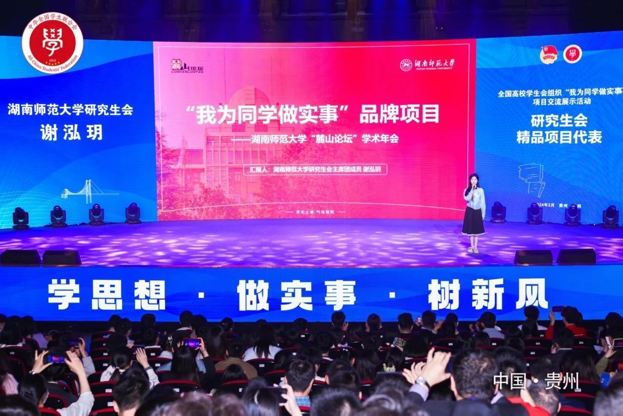 在首届全国高校学生会组织“我为同学做实事”项目交流展示活动中,我校“麓山论坛”学术年会获全国精品项目。