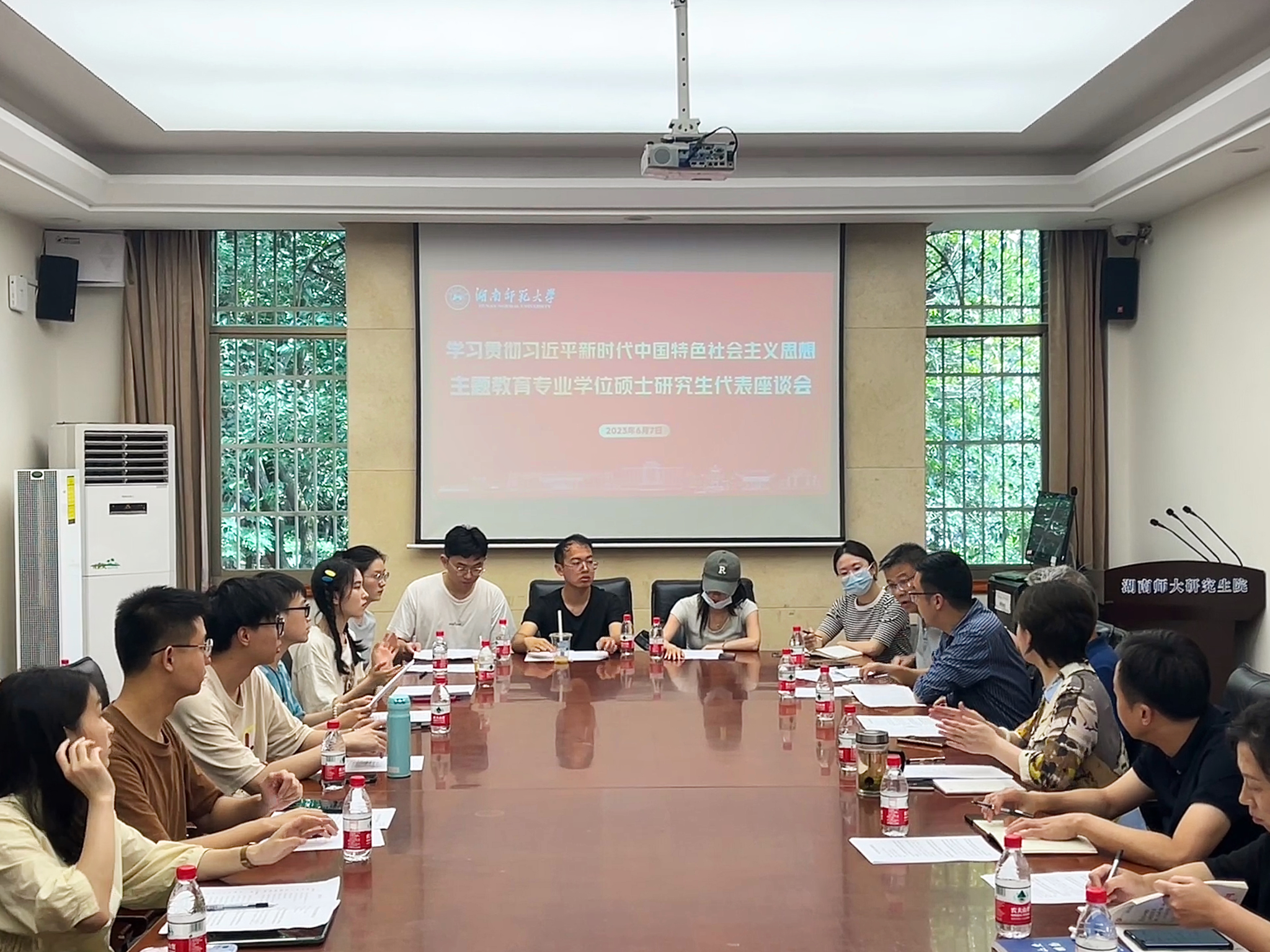 (通讯员 李琢)6月7日下午,我校在研究生院二楼会议室召开学习贯彻习近平新时代中国特色社会主义思想主题教育专业学位硕士研究生代表座谈会。校学位与研究生教育研究中心主任廖湘阳教授、研究生院全体在家领导参加会议,会议由党委书记龚舒主持。