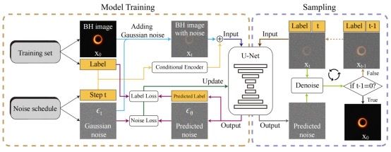 通过将事件视界望远镜(EHT)数据拟合到通过广义相对论射线追踪(GRRT)生成的模拟图像中,可以推断黑洞和吸积流的性质。然而,由于GRRT的计算密集性,生成特定辐射通量图像的效率需要提高。针对黑洞成像领域的这一难题,团队历时一年攻关,创新性地将人工智能技术融入了黑洞物理的研究。这种方法首次通过扩散架构实现物理参数到黑洞图像的端到端生成,在极大程度降低传统方法算力需求的同时,生成的图像与真实GRRT模拟高度一致,且能准确反映输入参数的变化。此外,通过生成的图像增强训练数据后,基于深度学习的参数回归模型在黑洞物理参数预测上取得了性能显著提升。该研究为黑洞图像的研究提供了一种快速、精准、低成本的AI驱动新范式。